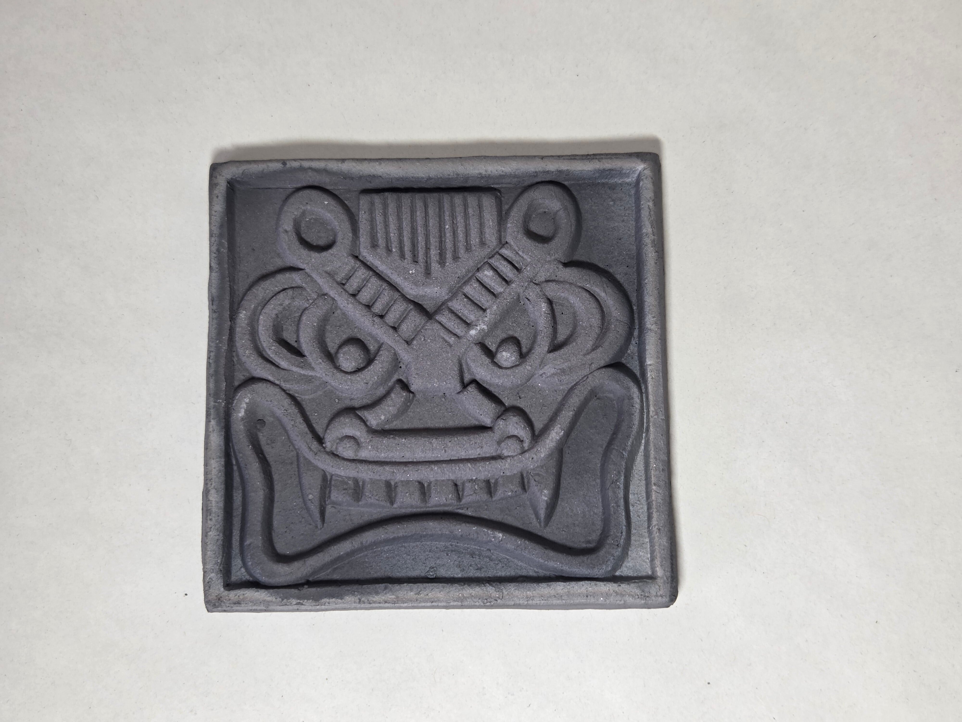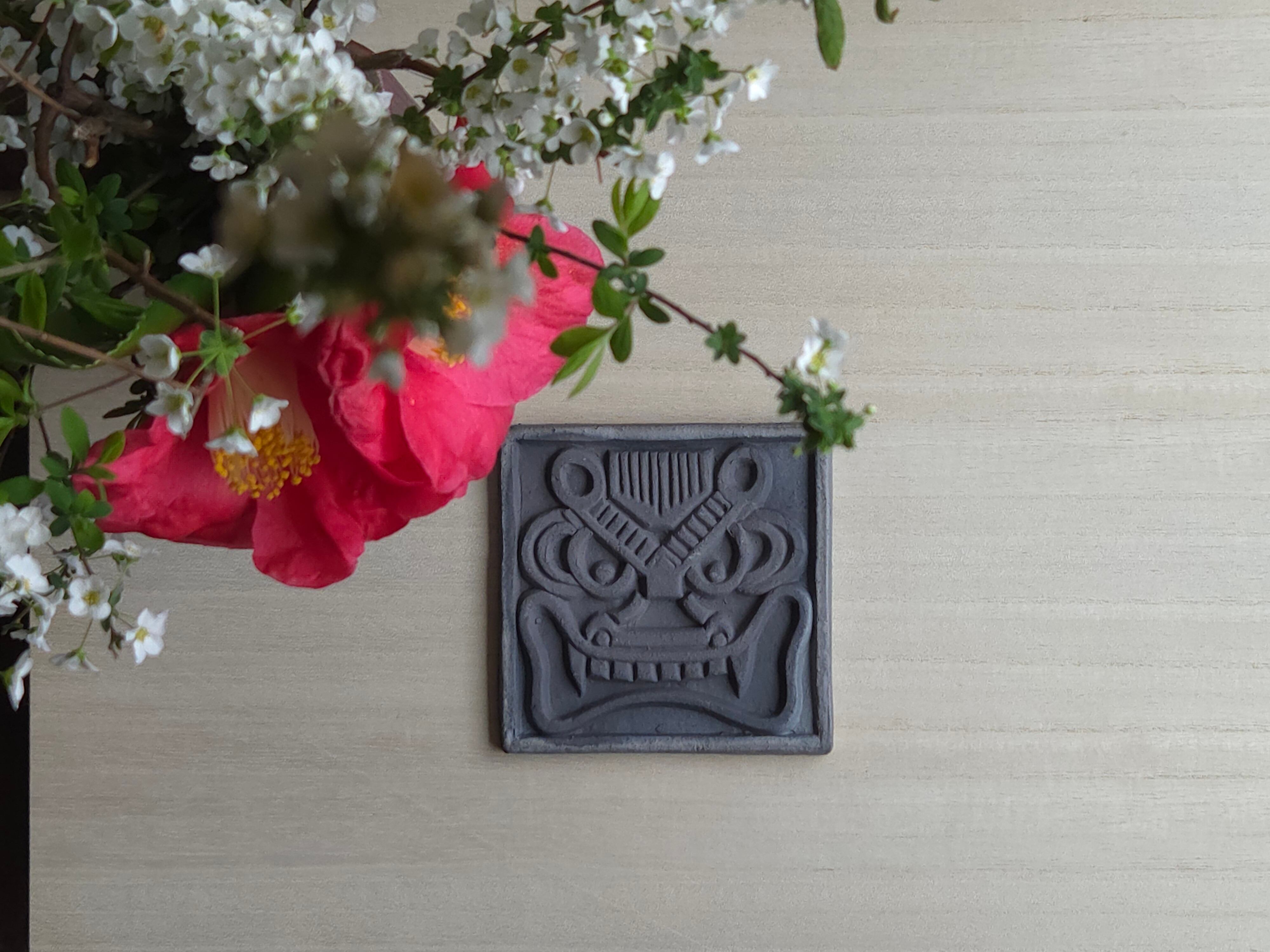 鬼瓦の意匠を正方形に落とし込んだ、瓦素材のコースターです。